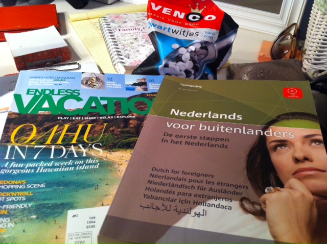 Day 100 – Today was a busy day. This is an image of my desk which captures a little bit of my messy little world. It has my new Dutch book, dreaming of my first trip to Hawaii, a few Dropjes, my paper organizer that I still love, my Stella & Dot clutch/purse that carries my wallet and essentials and can be easily transferred from tennis bag, to car, to school, etc., fun sunglasses, and lots of papers! But back to my busy day…