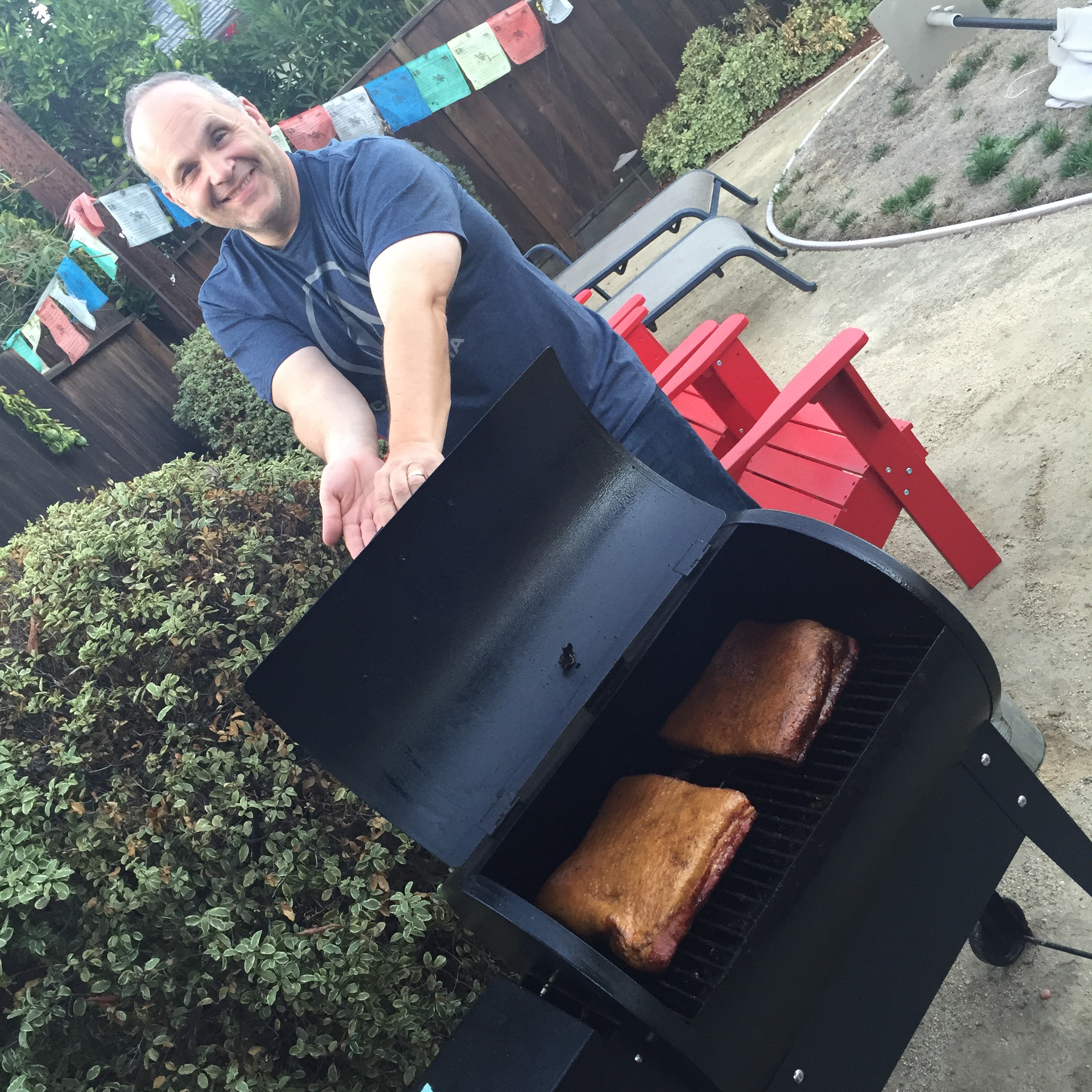 I bought a pork belly at Costco last week, and it has been sitting in our refrigerator, rubbed in spices and curing, as he turned the slab from side to side every day, awaiting today’s smoking.  After it smokes, he will slice it and share it and fry it in a pan.  I can’t wait. I know his friends are anxiously waiting too for the day to arrive with bacon in hand. Who doesn’t love bacon?