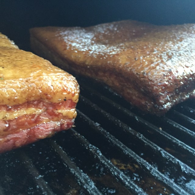 Like right now, he’s making a slab of bacon on the smoker, which has been smoking for 6 hours. The smell of the apple wood chips burning in the smoker is drifting into my kitchen while I write. I’m smelling the sweet smells and hearing the hum of the smoker’s convection fan. He promised his friends at work that one day he’d bring them some home made bacon, but he didn’t tell them when he would bring it in. I bet they are going to be surprised this week.