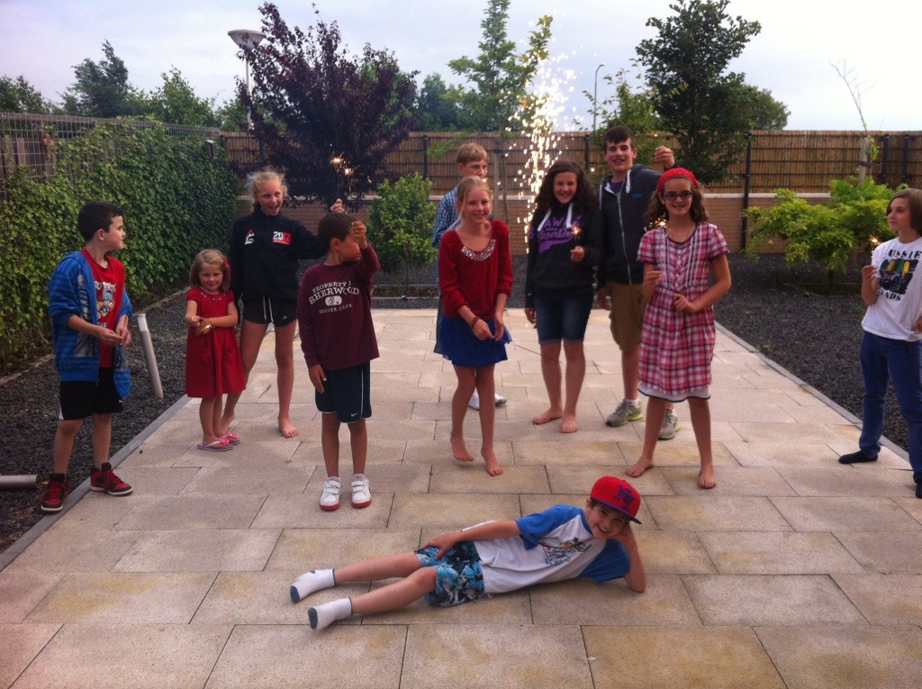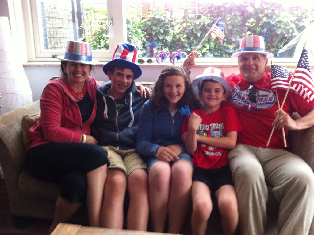 I worked with the kids all day today, cleaning out all the kitchen cupboards and preparing for our big move in 4 more days. And then I spent a few minutes freshening up, preparing hamburgers and salads to bring to the Fourth of July party at Bob and Danielle’s today. Juliana made April’s best chocolate cake to celebrate all the birthdays this month and last, and off we went to enjoy our friends and Independence Day. I was so busy today, that I didn’t have much time to feel homesick, even though I missed singing Firework with Jessie on top of our lungs this year, out in the field in Cupertino!! It was jacket weather- cold in Holland today, and it didn’t get dark until after 10:30 pm…just a bit different from California!! All is good…