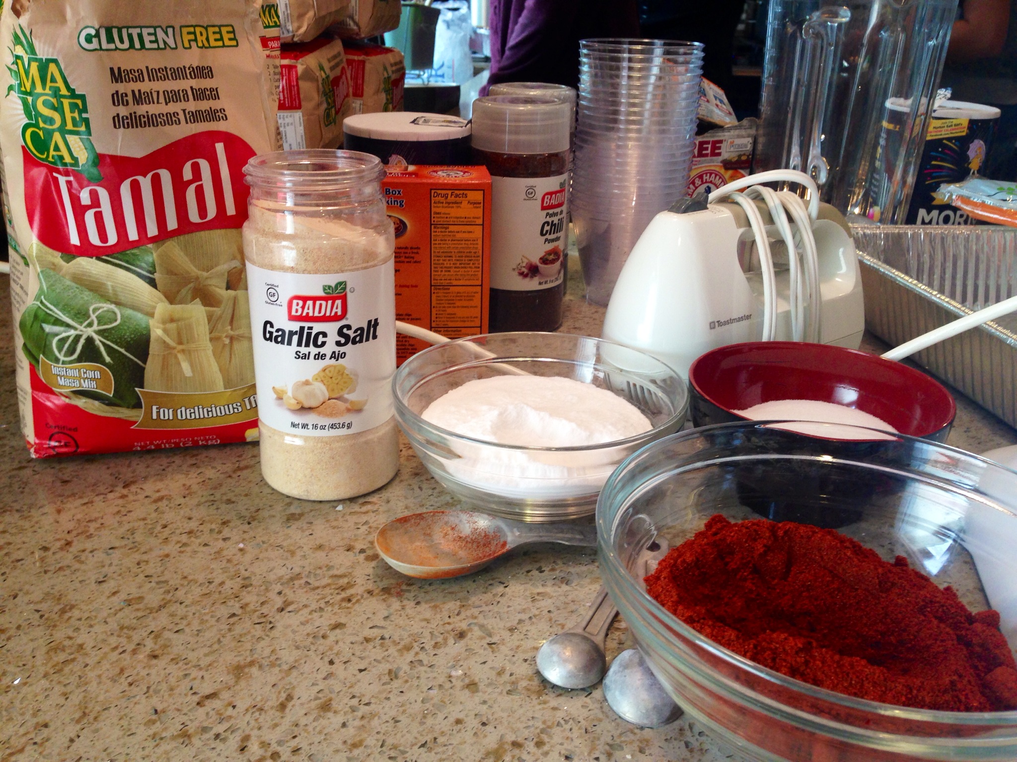 Adriana made homemade red and green sauces, as well as shredded chicken and pork to use as fillings before we arrived. There were bowls of shredded cheese and a vegetarian mixture of corn and beans and salsa as well.